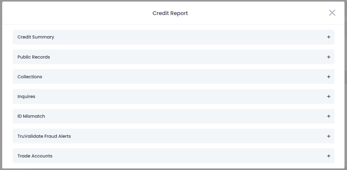 The Credit Report contains the following subsections: