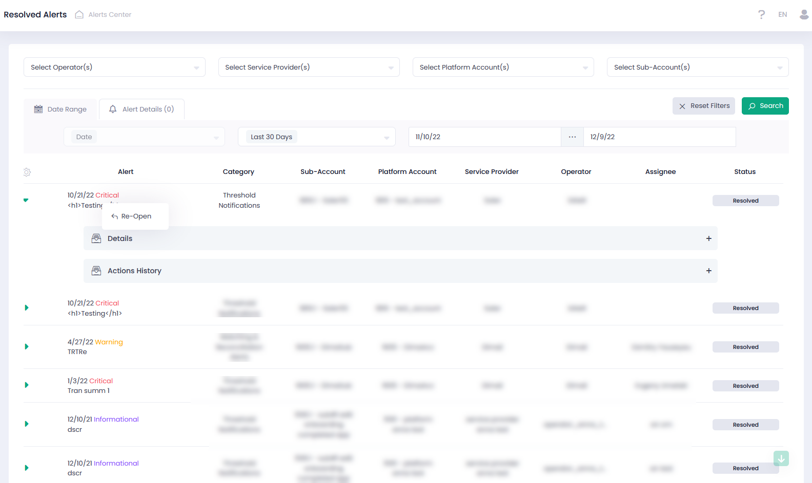 This screen displays all resolved alerts with status Resolved for the specific Operator/Service Provider/Platform Account/Sub-Account.