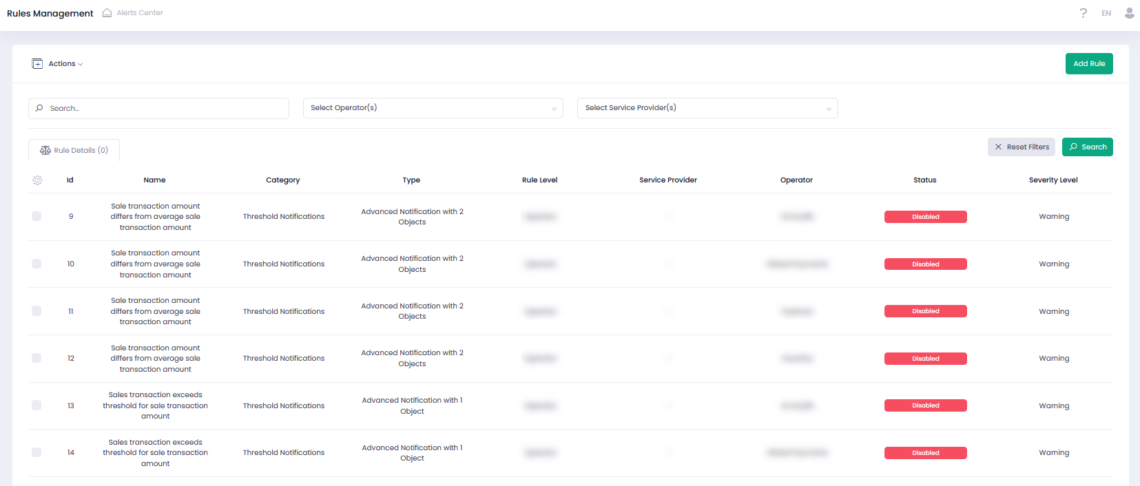 The Rules Management screen is enabled for the system users with Operator, Service Provider Admin and/or System Admins permission levels.