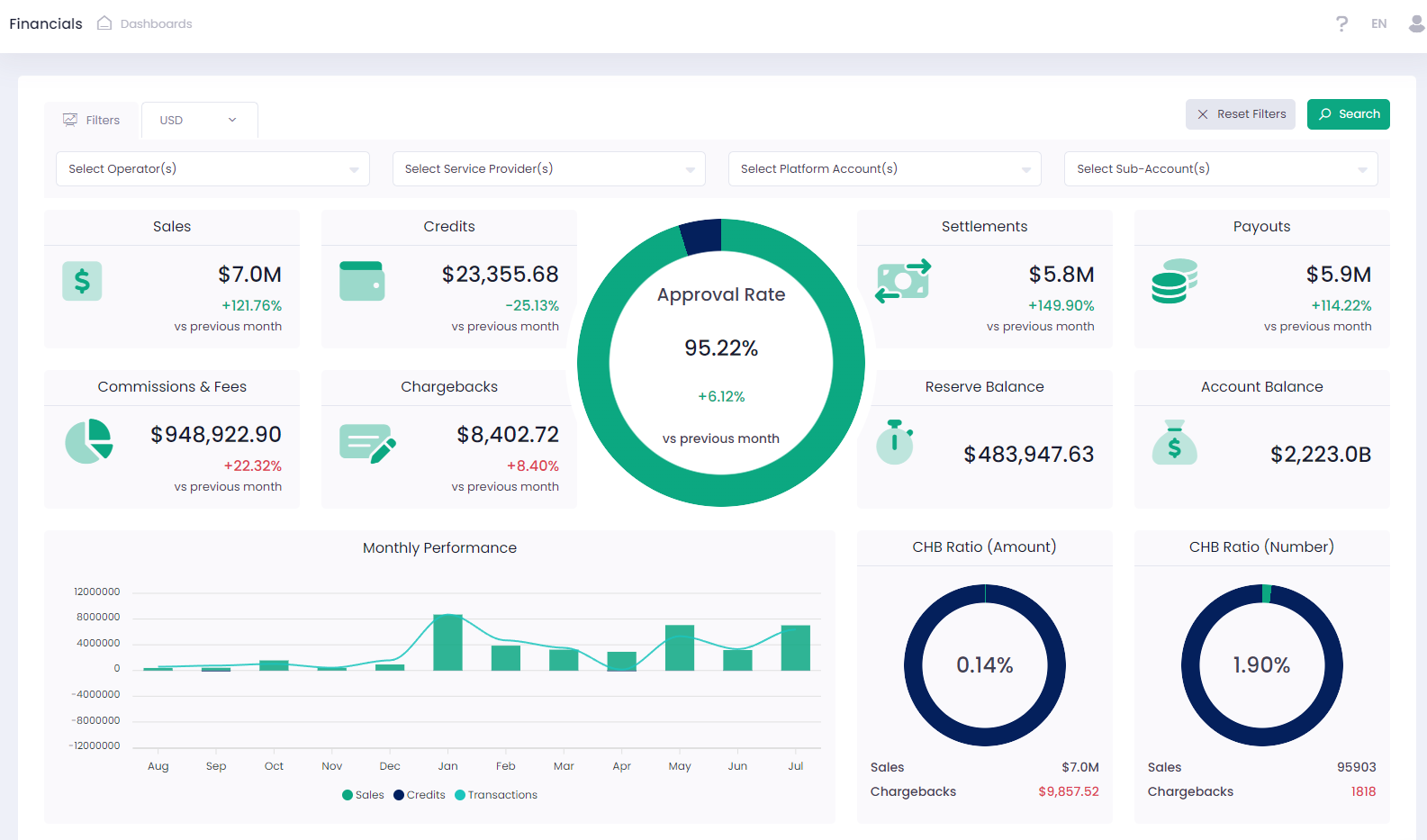 Financials display key financial data for the current month compared to the same period of the previous month. The data displayed on the dashboard is aggregated by all Sub-Accounts to which the user has account permissions if specific Sub-Accounts were not defined using filters. Financials dashboard is available for all User Roles.