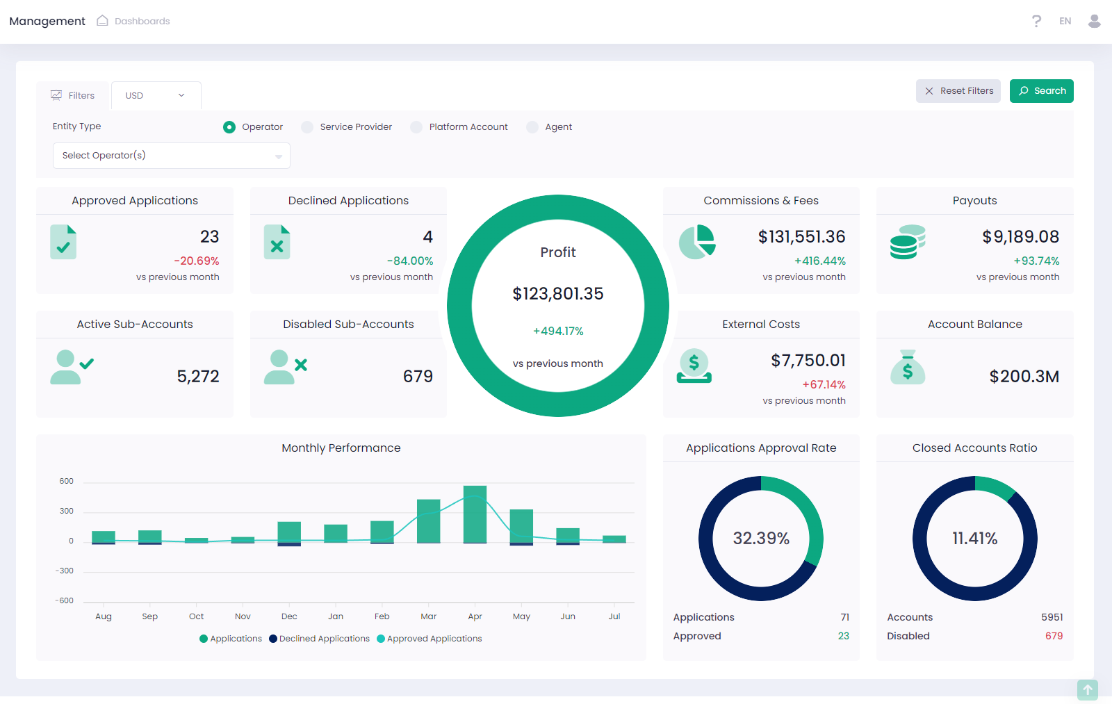 Management dashboard displays key indicators of business development for the current month compared to the same period of the previous month (‘Active Sub-Accounts’ and ‘Disabled Sub-Accounts’ widgets display data as of the beginning, not just for the current month).