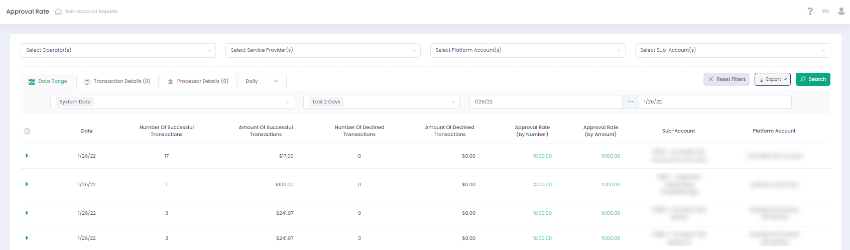 The Approval Rate by Number resp. Amount displays the percentage of the approved transactions as a ratio of the sum of the approved and declined transactions