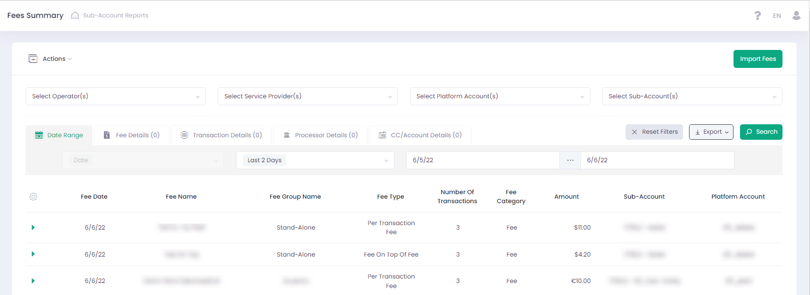 The Fees Summary report provides a complete overview of all the incoming and outgoing fees that have been processed on a specific Sub-Account.