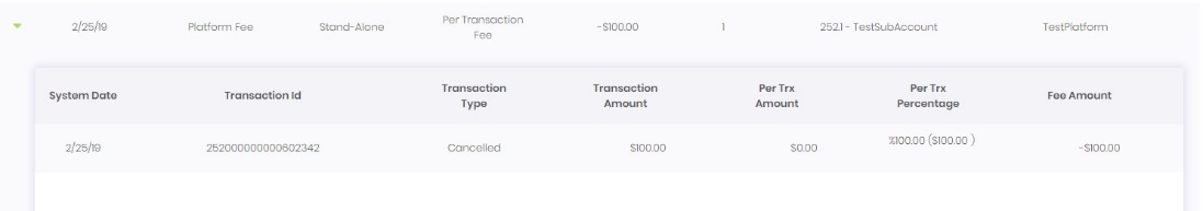You can also display relevant transactions details for which fees have been calculated by unfolding each specific record in the report grid.