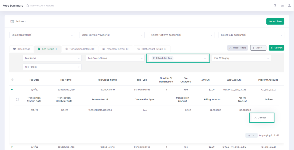 In the Fees Summary Report cancelled fees are displayed in the fee details grid with the negative Amount value and the transaction type Cancelled.