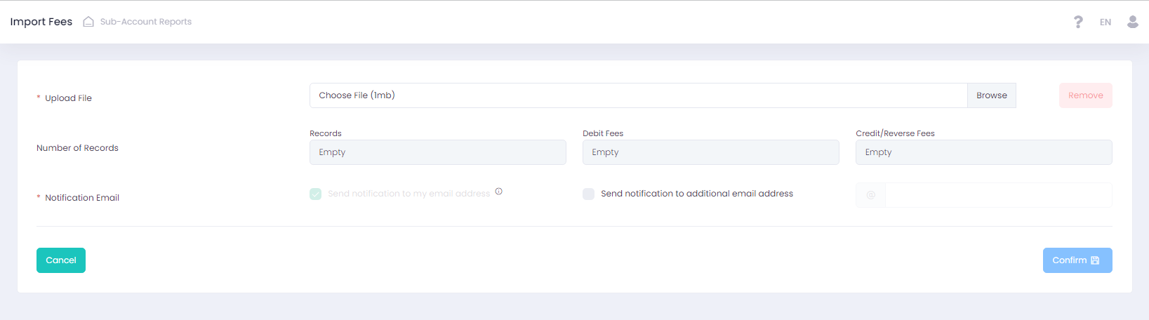 The system allows to process fees by uploading fee data in the Fees Summary report via a .csv file (max file size is 1 Mb). To upload a file with fee data, navigate to the Fees Summary report and click on the Import Fee button. On the following screen, you can upload a file and in addition to your own email, you can enter an additional email address for notifications.