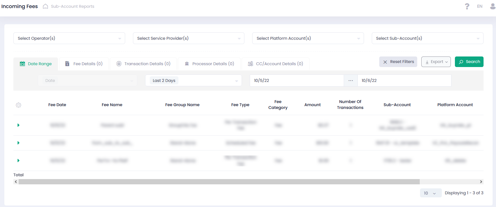 The Incoming Fees report provides a complete overview of all the fees that have been received by a specific Sub-Account.