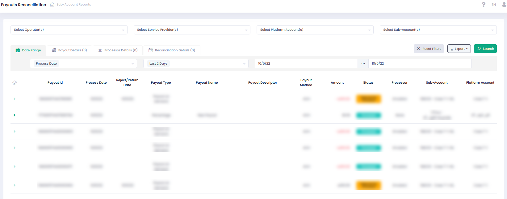 The Payouts Reconciliation report displays detailed Payout information allowing to reconcile the funds paid out to the transactions they apply to.