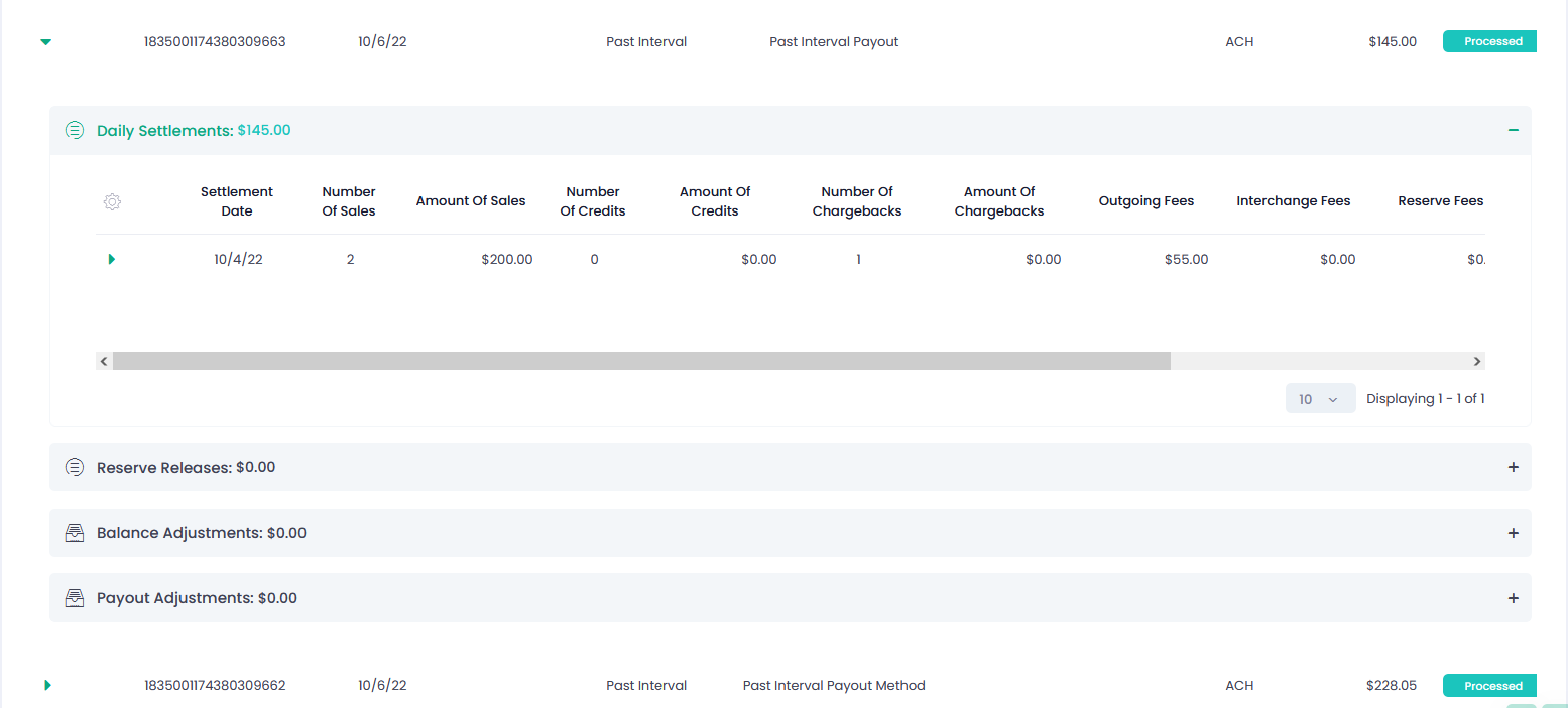 | Past Interval | Payout amount is calculated from the total amount of daily settlements, incoming fees, adjustments, reserve balance release, on-demand payouts and cancelled payouts transactions for the specified time range |