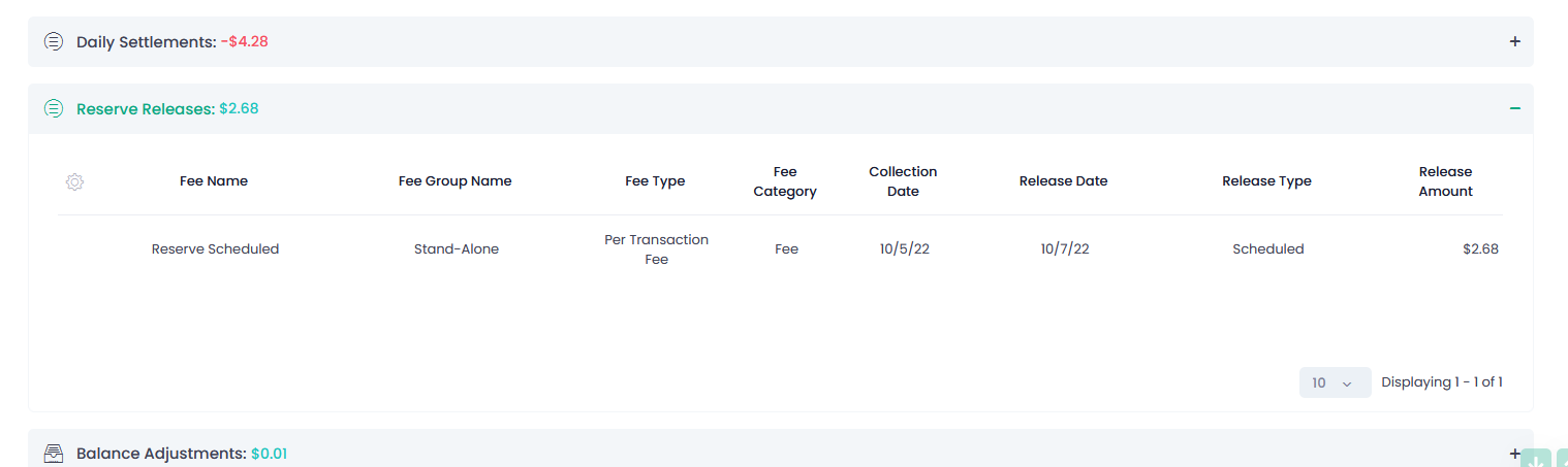 The Reserve Releases section represents the reserve balance that is included in the payout calculation.