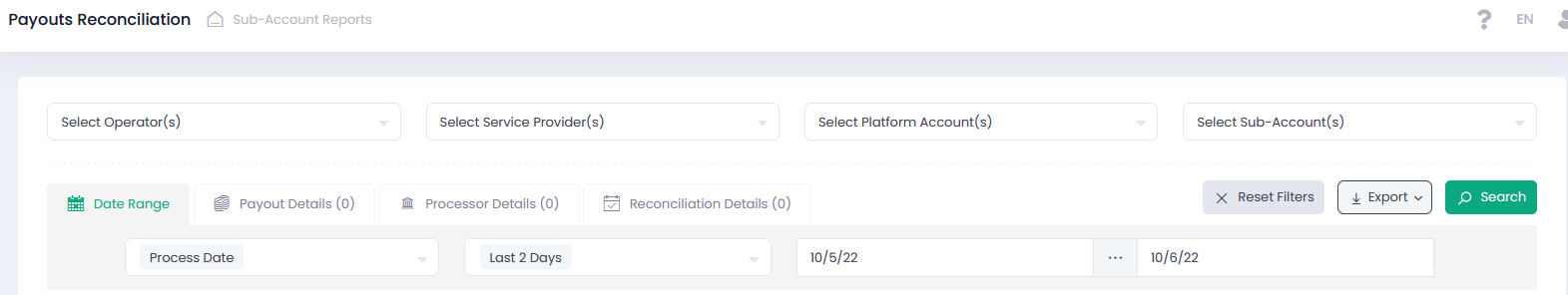 - In the Reconciliation Details filter tab, you can enter Transaction Id, Merchant Transaction Id, and Processor Transaction Id.