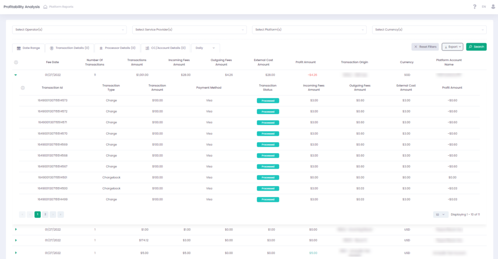 Profit Amount = [Incoming Fees Amount] – [Transactions Cost Amount] – [Outgoing Fees Amount], the value is green/red for positive/negative cases.