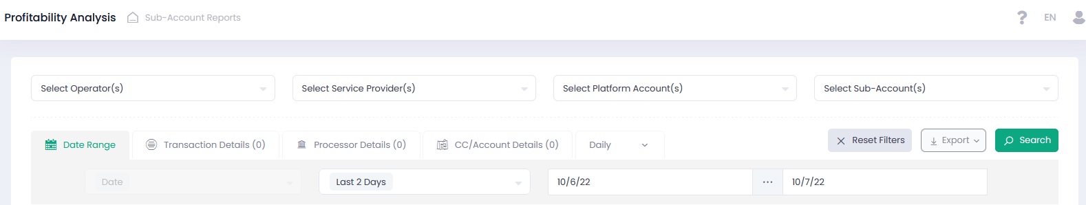 • To display the report for a specific Sub-Account, select Service Provider, Platform Account, and Sub-Account. The prior selection determines the latter available options.