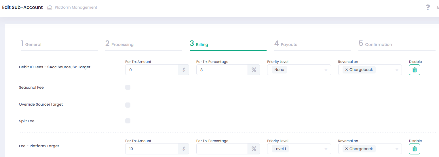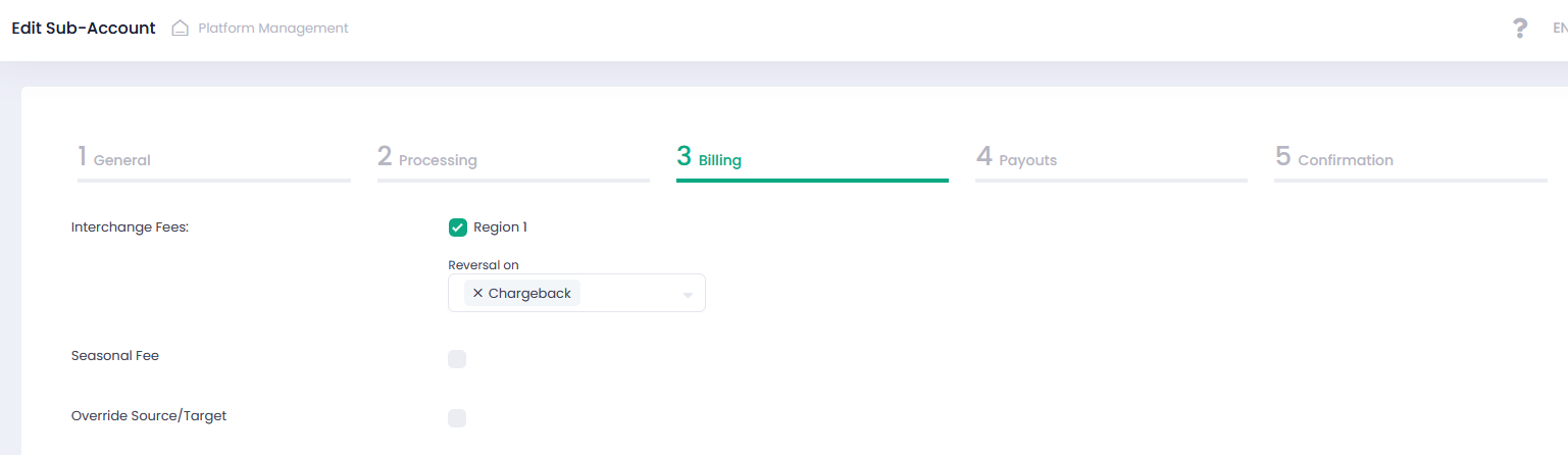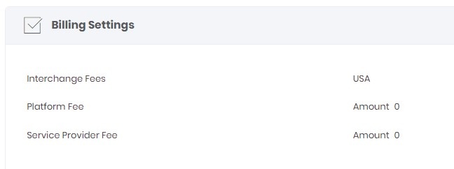 Billing is an optional step where you can configure commissions and fees for your Sub-Account based on your Service Provider settings. At this step you can configure regular and interchange fees, that have been preconfigured at the corresponding Service Provider level with Fee Source=Sub-Account. In case no such fees have been created at the Service Provider level, the user will see a corresponding warning message.