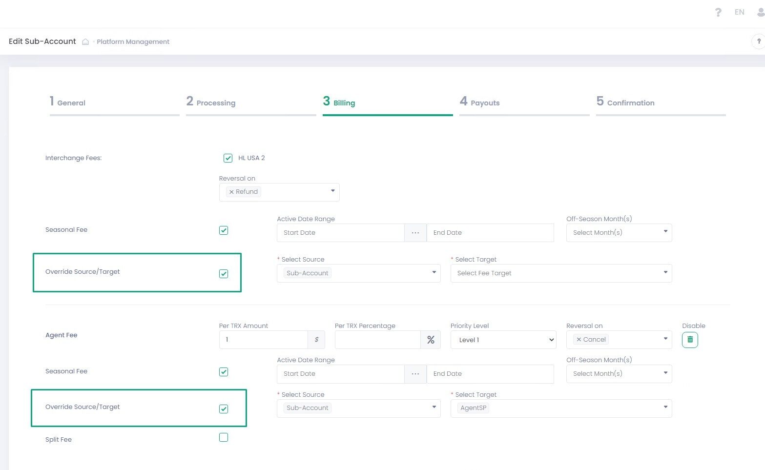 Override Source/Target allows overriding default Fee Source and Fee Target for all types of fees. Set values can be viewed in the Sub-Account Billing Details. Available Fee Source and Fee Target options depend on your specific configuration. This feature is disabled in case Fee Target = Reserve Balance has been configured on a Service Provider/Fees and Residuals level for a specific Sub-Account fee.