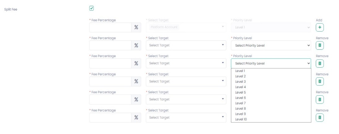 - At each new split level set Percentage Amount, select Fee Target and Priority Level. Fee Target available options depend on your specific configurations.