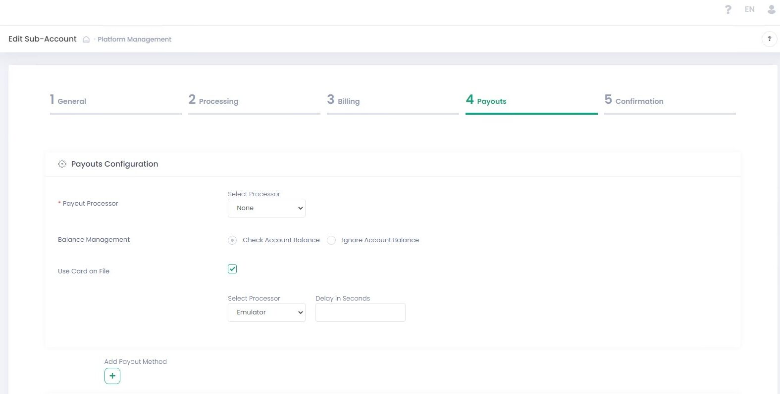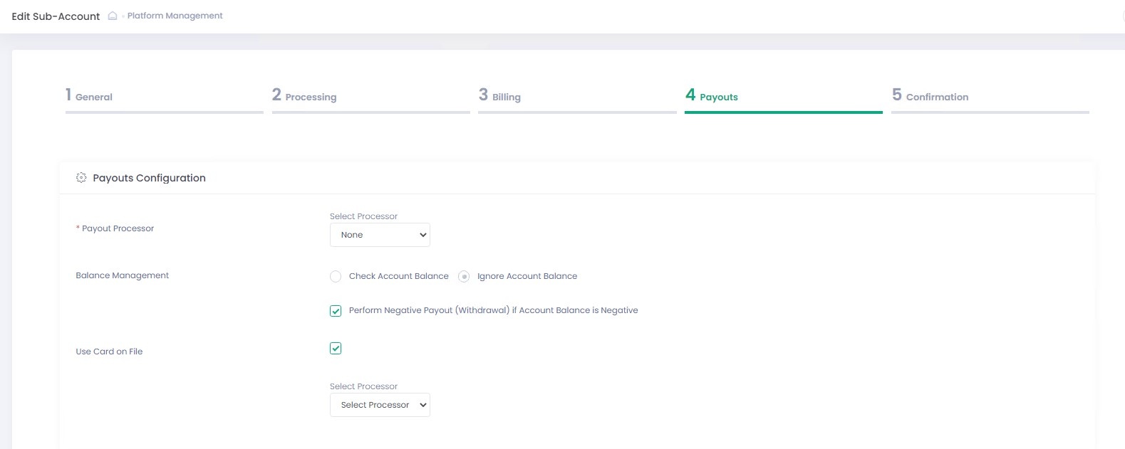 | Use Card On File | In case selected, negative payouts for this Sub-Account will be processed according to the configured Card On File instructions in the first place. In case of a failure of such operation, negative payout is processed via ACH as usual |
