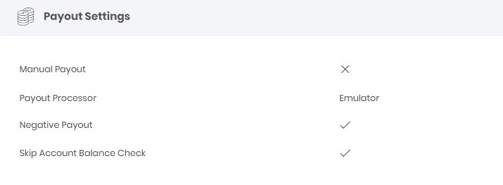Configure manual and automated payout options, payout processor and its parameters in this section. Use Balance management to configure Negative Payouts.