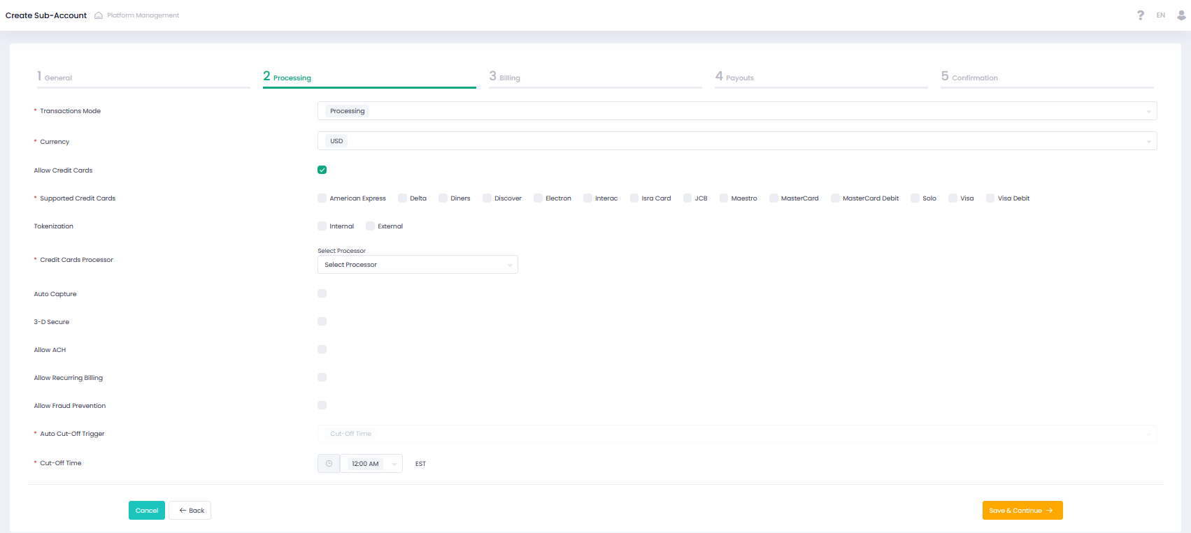 Please configure Sub-Account transactions processing options like credit card, ACH, gift cards, transaction processing mode and enable functions such as recurring billing, auto capturing, and fraud detection. The system allows you to choose an in-house transaction processing gateway or use an available external processor.