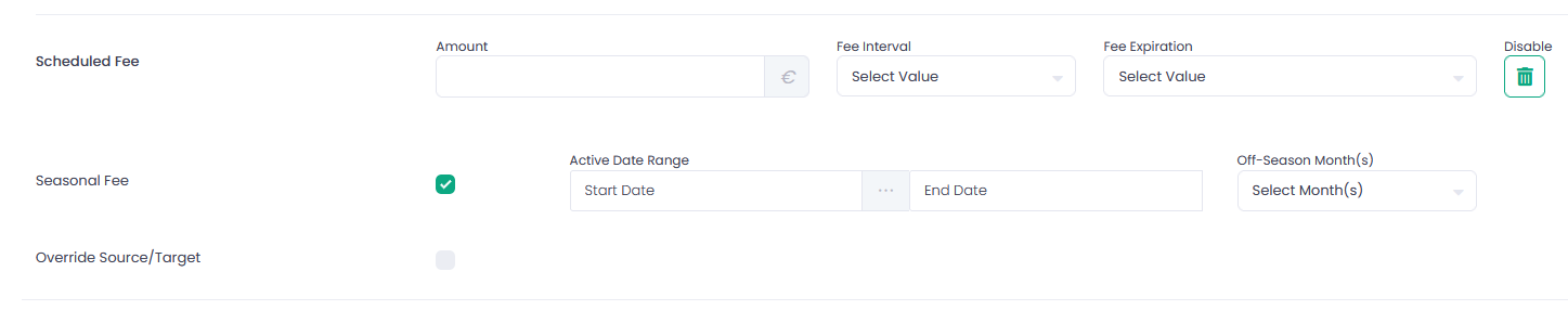 Scheduled Fees allow configuring a fee with a preset amount calculation, a specific interval and duration. You can configure amount, interval, and a fee expiration.