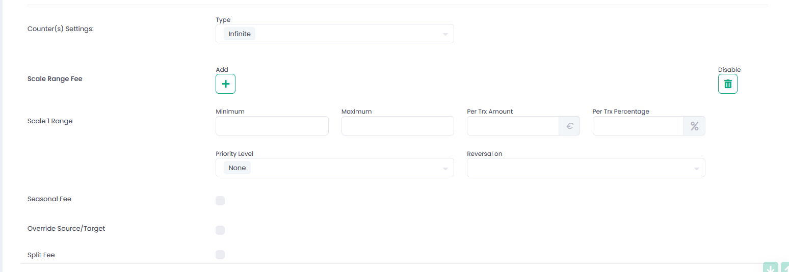 Scale Range Fees allow configuring an amount of fees based on the transaction counts. You can preset several scale ranges to determine fees amounts.