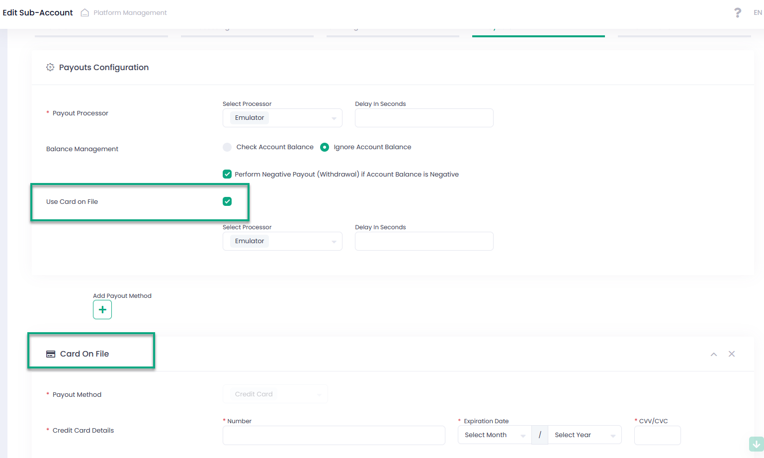 - In Payout Configuration activate Use Card On File and select a Card On File Processor