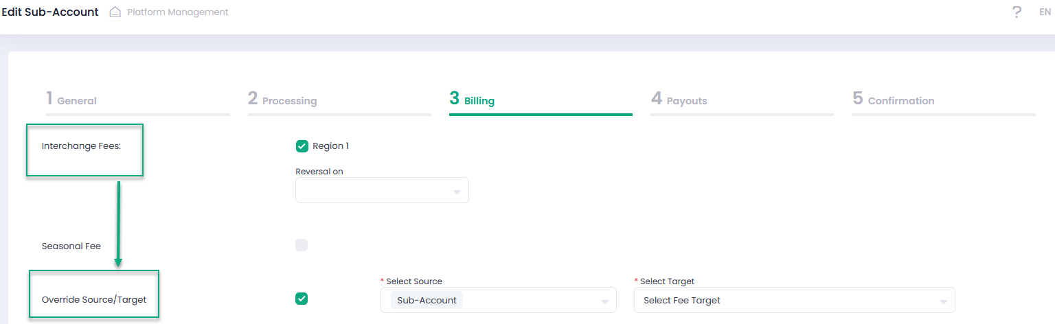 At the Billing step you can override the original Interchange Fees source/target, determined by the related Service Provider.