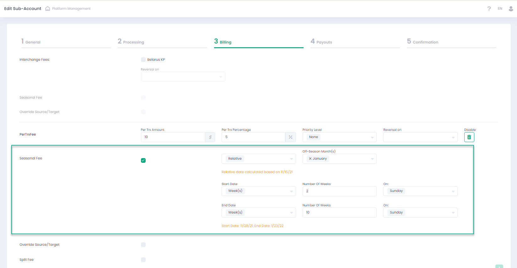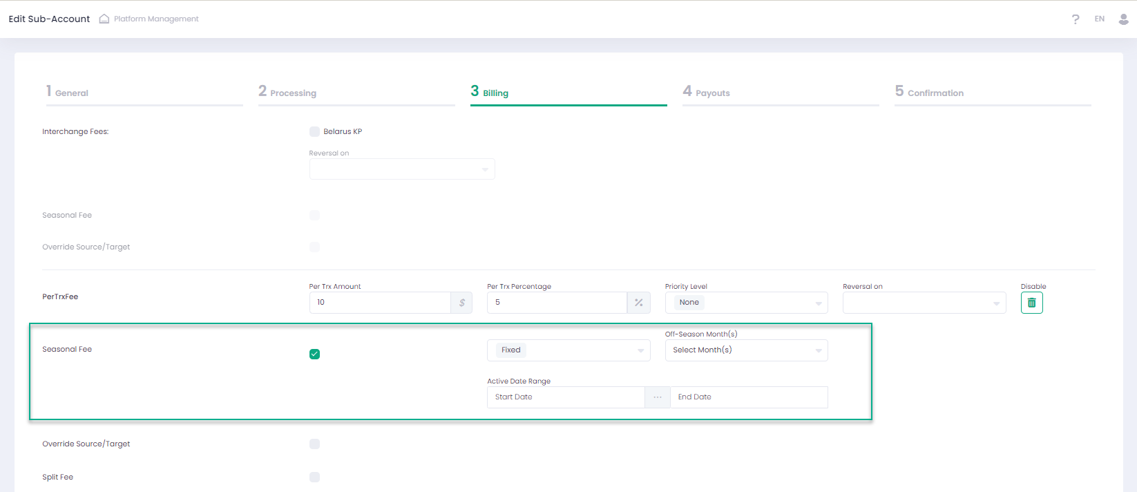Seasonal Fee option is enabled for all fee types, including Interchange Fees. This feature is optional and in case skipped, fees are always active. Seasonal Fees settings are displayed in the Sub-Account Billing Details at the Onboarding Confirmation step and in Sub-Account Details on the main Sub-Account screen.