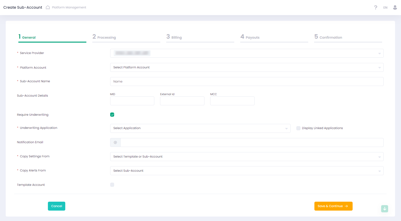 Sub-Account onboarding is a five-step procedure that allows to create and/or edit Sub-Accounts. The procedure consists of the following steps: