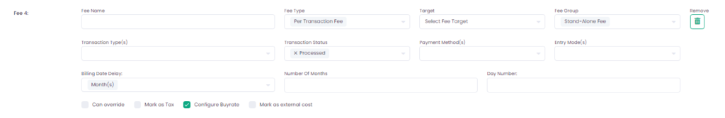 - Fee Target options: Sub-Account, Agent, Platform, Service Provider. Operator and Reserve Balance cannot be targets for Buyrate.