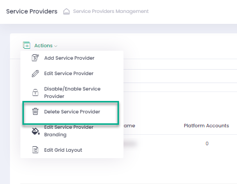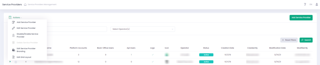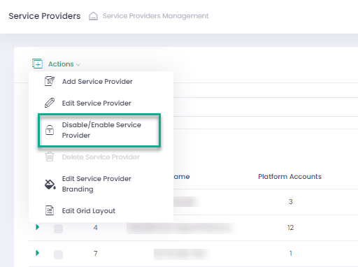 - You can also Disable/Enable Service Provider by clicking Actions in the last column of the table and selecting the appropriate option
