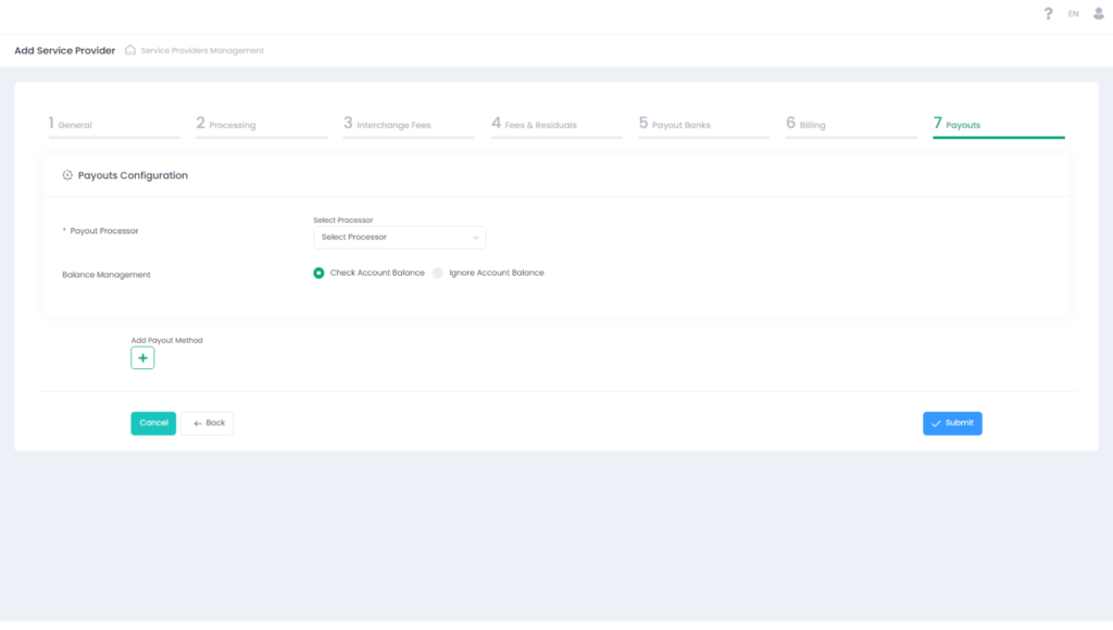 In this step you can create Payout Bank(s) for your Service Provider. Payout Banks are banks that will be used to make payouts for all System Entities. Service Provider is the System Entity that manages all the pay-ins and pay-outs.