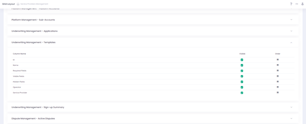 Grid Layout customization allows configuring visibility and order of the columns in the reports grid. The list of available reports and its columns is provided on Service Provider Grid Layout page. It is available via “Edit Grid Layout” from the Service Provider Actions list.