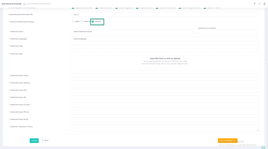 | Service Provider Name | Service Provider Company Name that will be displayed in the Back-Office | Required |