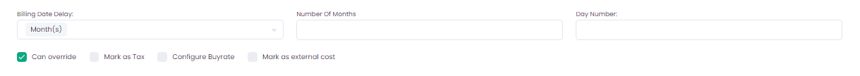 | Months | Enter Number Of Months value to determine a fee monthly billing delay time span and Day Number value to select a billing sequential calendar day |