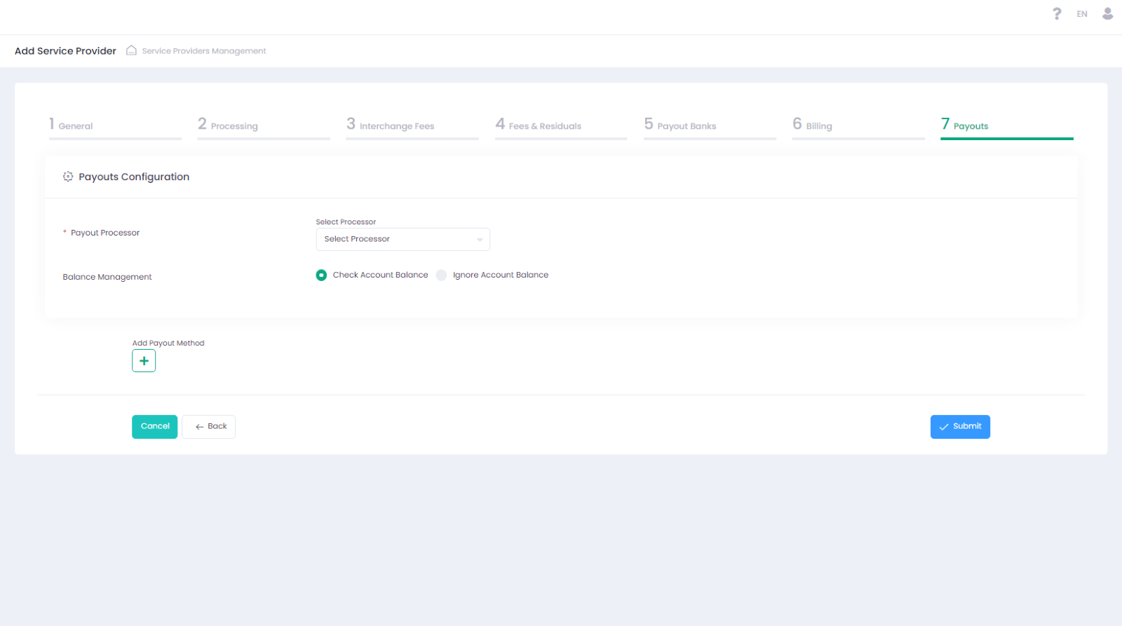 In this step you can create Payout Bank(s) for your Service Provider. Payout Banks are banks that will be used to make payouts for all System Entities. Service Provider is the System Entity that manages all the pay-ins and pay-outs.