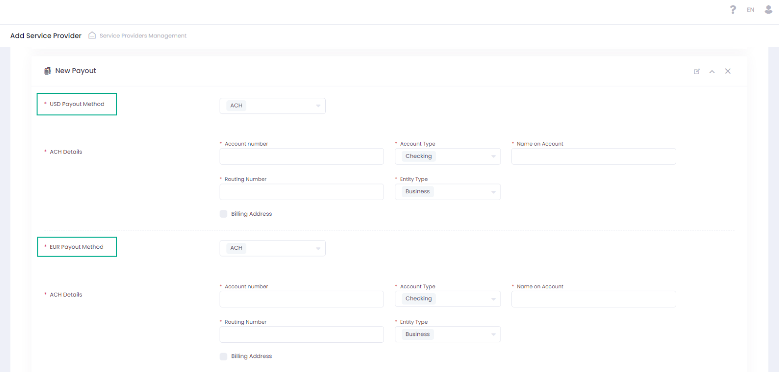Payout Banks for Platform Accounts and Sub-Accounts are determined automatically based on the Service Provider settings and the currency type configured for each Sub-Account.
