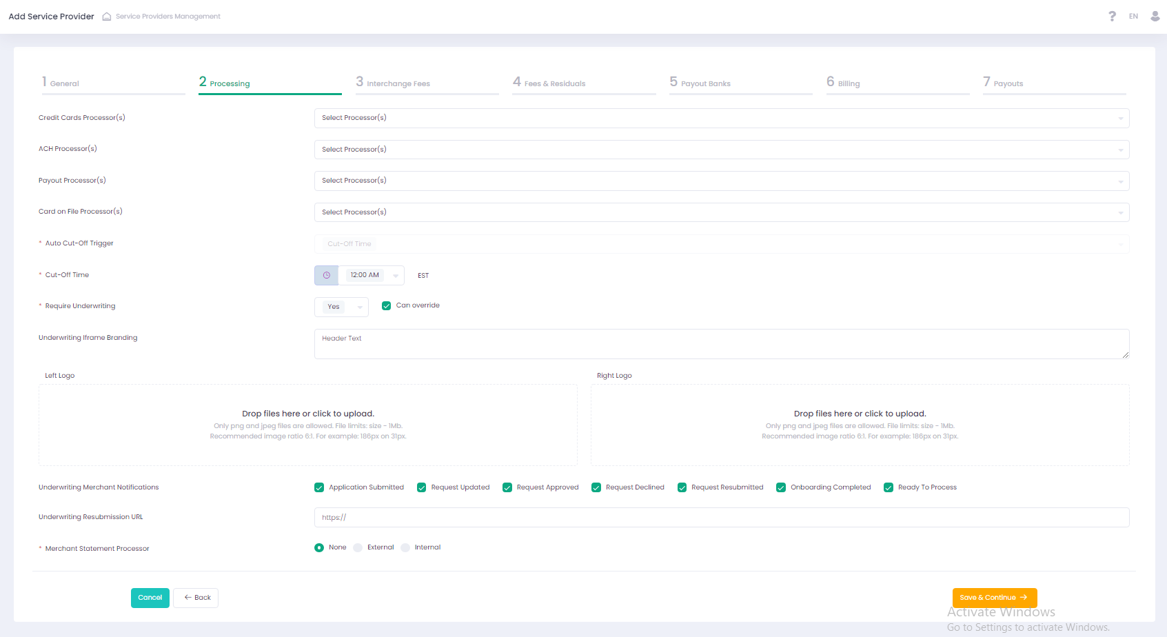 The selected processors will be in the available options for Platform Accounts and Sub-Account that will be created under this Service Provider. Click each text area to show all the available options. You can select more than one option in each field.