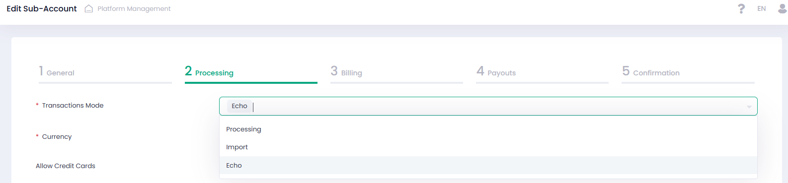 Select this Transaction Mode in case transactions are processed via an external processor. Following Transactions data is sent to the System by the Merchant/Seller via the System Echo API in real time to perform Billing, Reconciliation, and Payout operations.
