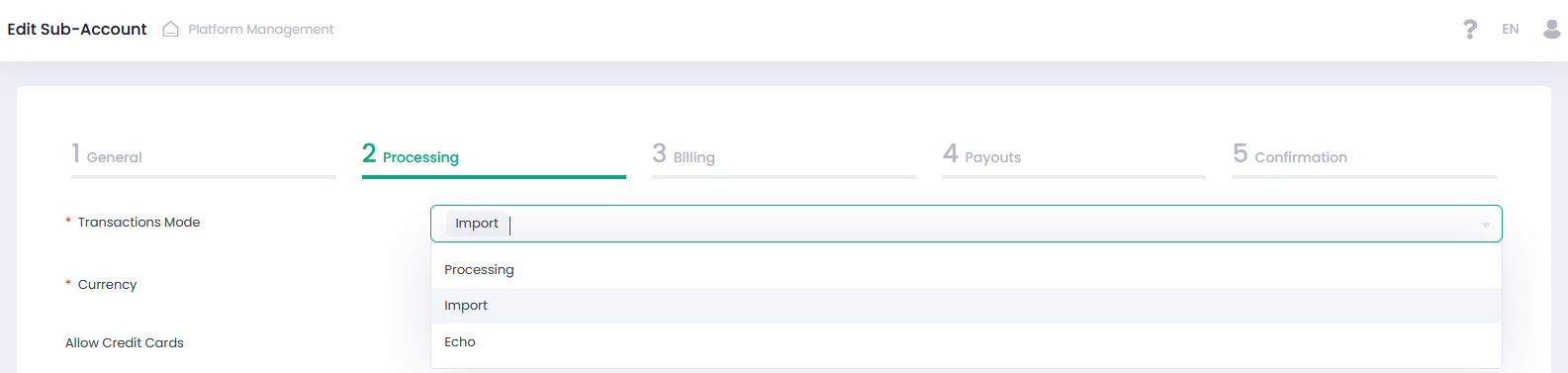 Import Mode Select this Transaction Mode in case transactions are processed via an external processor. Following Transactions data is imported to the System via external API or SFTP files to perform Billing, Reconciliation and Payout operations. Still stuck? How can we help? Was this page helpful? Yes No How can we help? Send