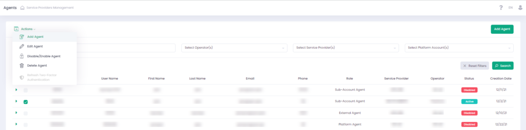 Use filter to query Agents in relation to a specific Operator, Service Provider, Platform Account, Sub-Account, or existing Agent name.